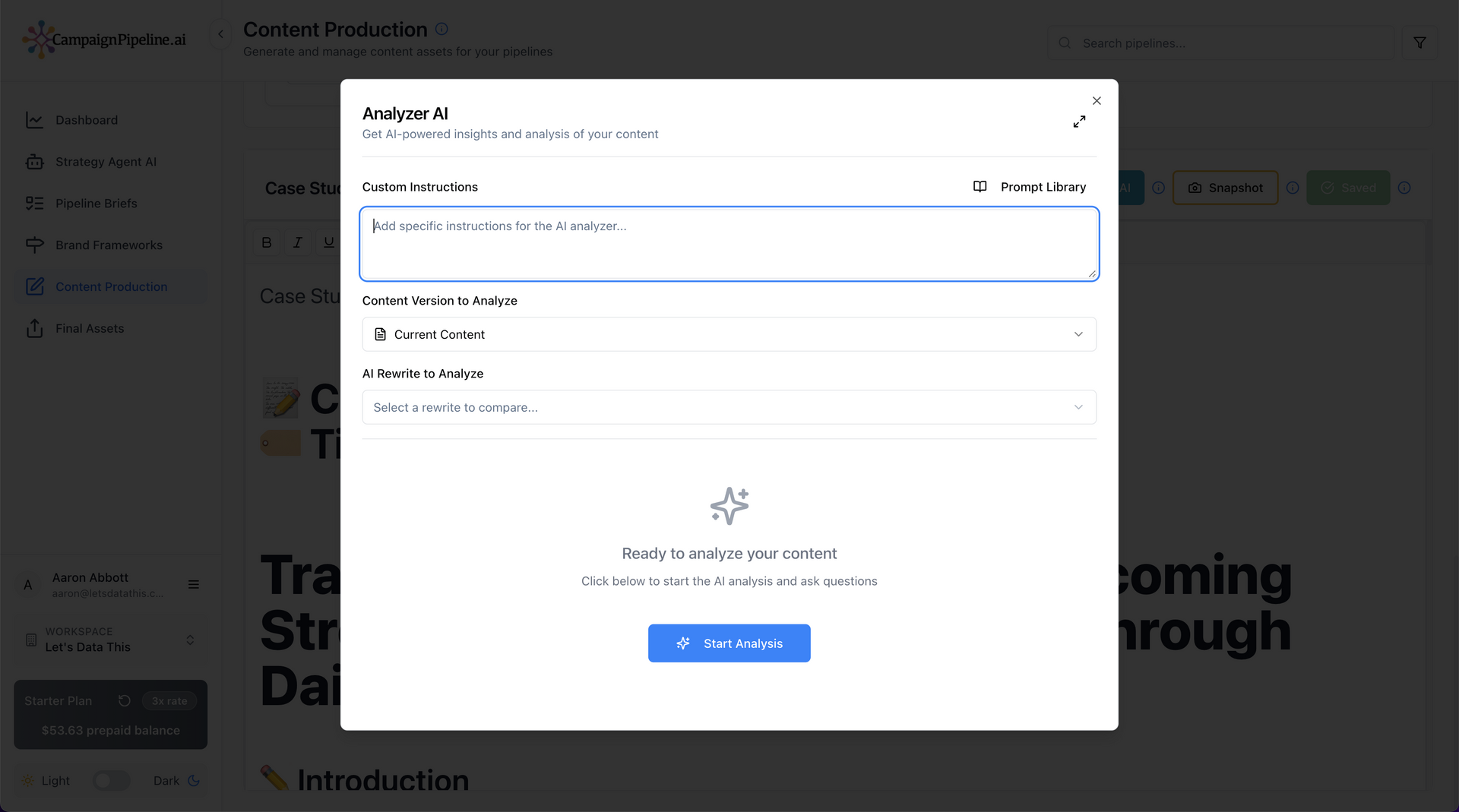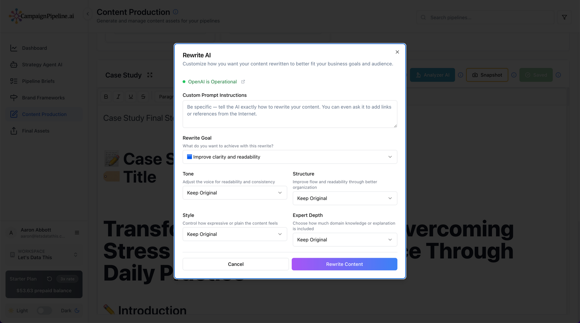 Campaign Pipeline gives you the power to create unified, high-quality campaigns without the chaos. It connects strategy, content creation, rewriting, and analysis into one simple flow — so your marketing team (or just you) can go from idea to polished campaign in minutes instead of weeks.